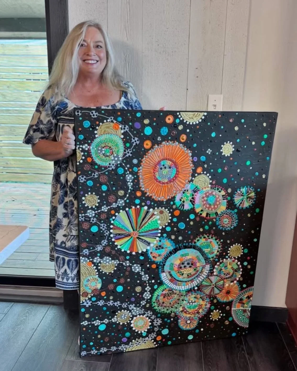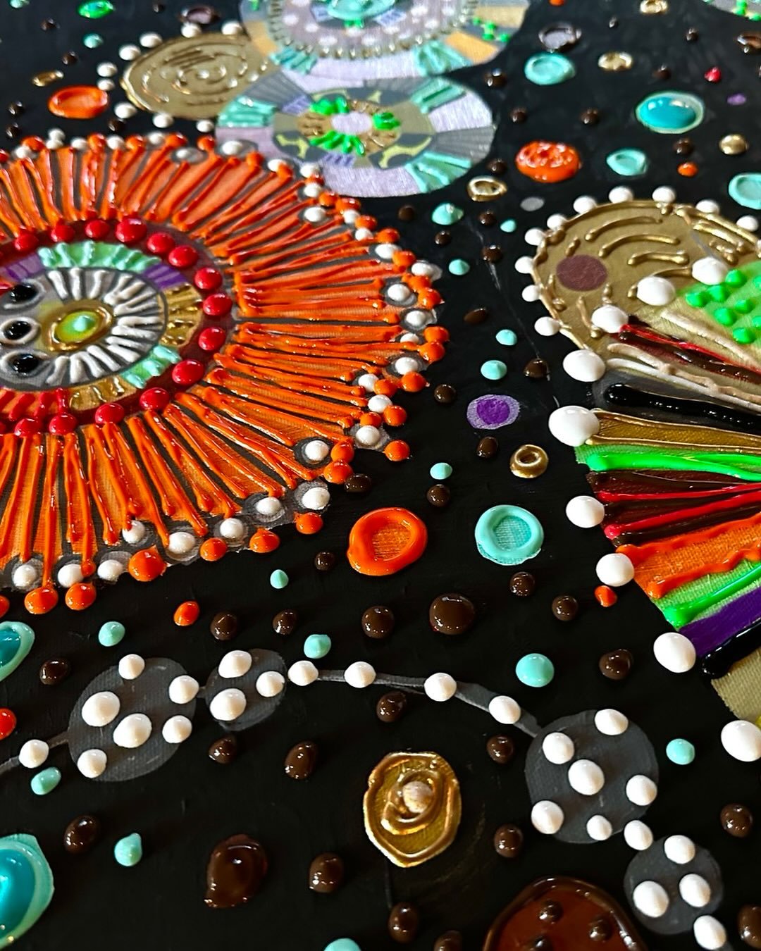 Prompted to create paintings inspired by her fiber art, this series moves freely between being cellular and botanically inspired. Ropes and vines, circles and dots, complementary and vibrational color activate the eye and recall the energy of Brandt’s fiber art.