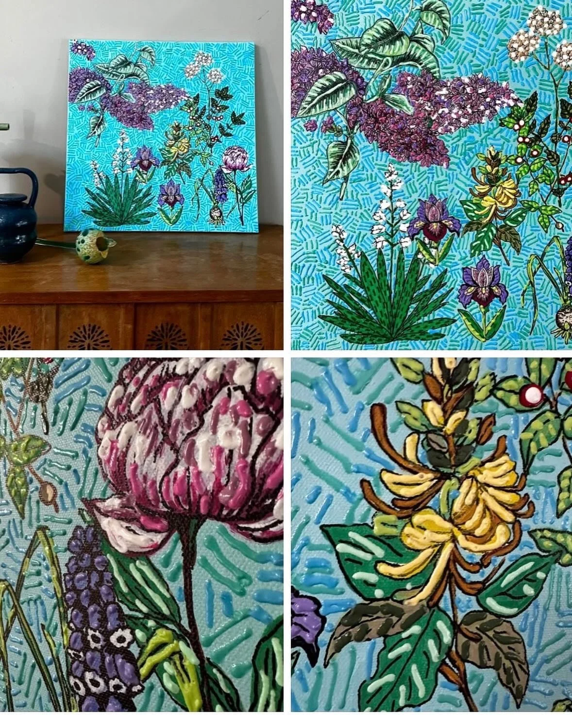 Whether using fiber, paint, drawing, or printmaking, Jan Brandt’s artwork is an invitation for viewers to indulge and invest more time in their perusal of her joyful compositions.
